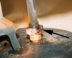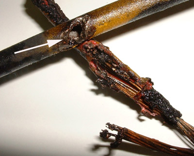A lightning strike on a home can cause intermittently high electrical currents to flow through a variety of conductors. It is not unusual to see metallic splatter from lightning related electrical current. Figure 5 shows a water heater where lightning attempted to jump a plumbing insulator from copper pipe to the iron fitting.