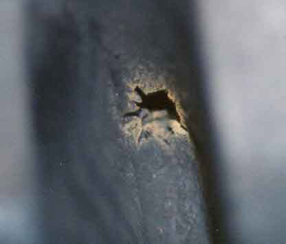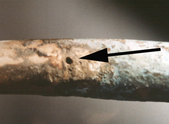 Figure 6 shows a pin hole from corrosive attack to a copper gas pipe near the foundation of a home. An explosion resulted from gas leakage, causing severe damage to the home. The corrosive attack was due to minerals in the soil reacting with the copper pipe.