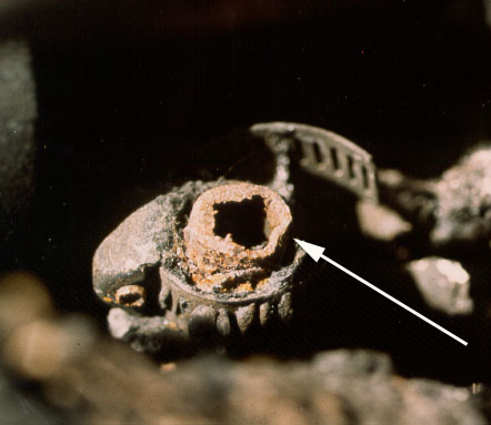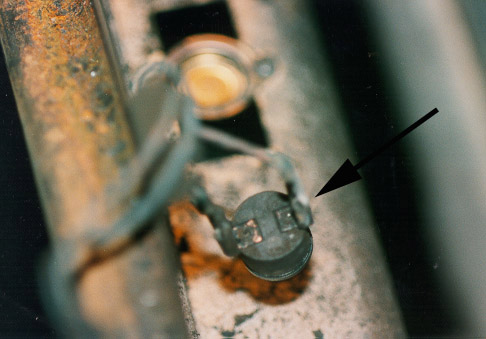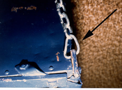 The arrow in Figure 8 points to an improperly repaired support chain for a car on a carnival ride. The owner had purchased the ride used and repaired the support chain with a crimp style chain link from a hardware store. This link arrangement could not sustain the dynamic loading of the carnival ride and failed, causing a fatality.
