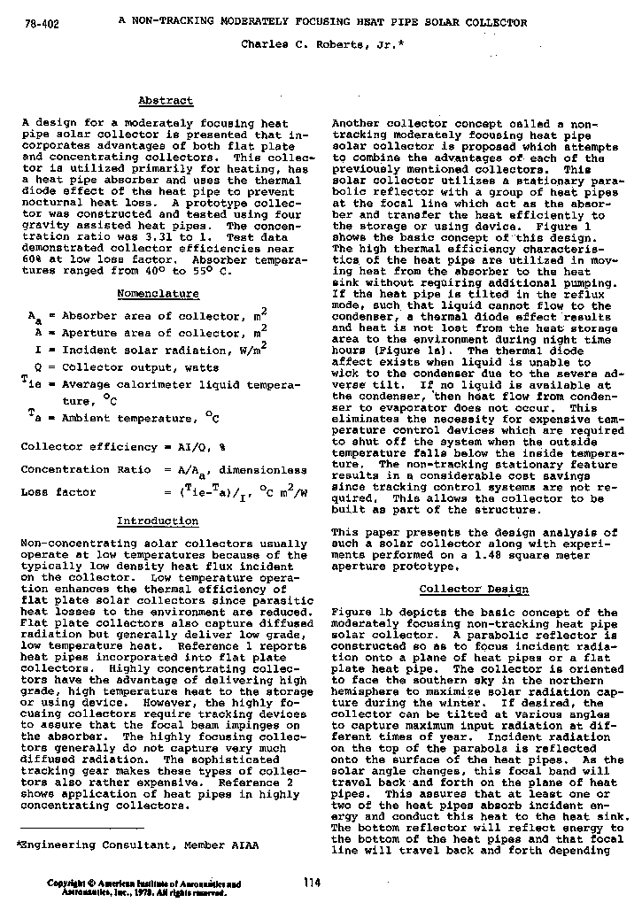 A NON-TRACKING MODERATLY FOCUSING HEAT PIPE SOLAR COLLECTOR (AIAA 1978)