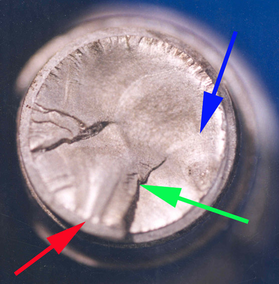 a typical bolt fracture surface showing a fracture origin area (red