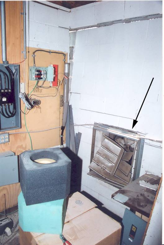 damage near a ventilation duct as indicated by the arrow.