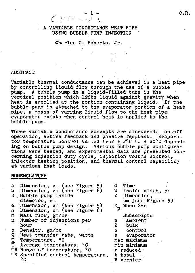 A VARIABLE CONDUCTANCE HEAT PIPE USING BUBBLE PUMP INJECTION (NHPC, 1976)