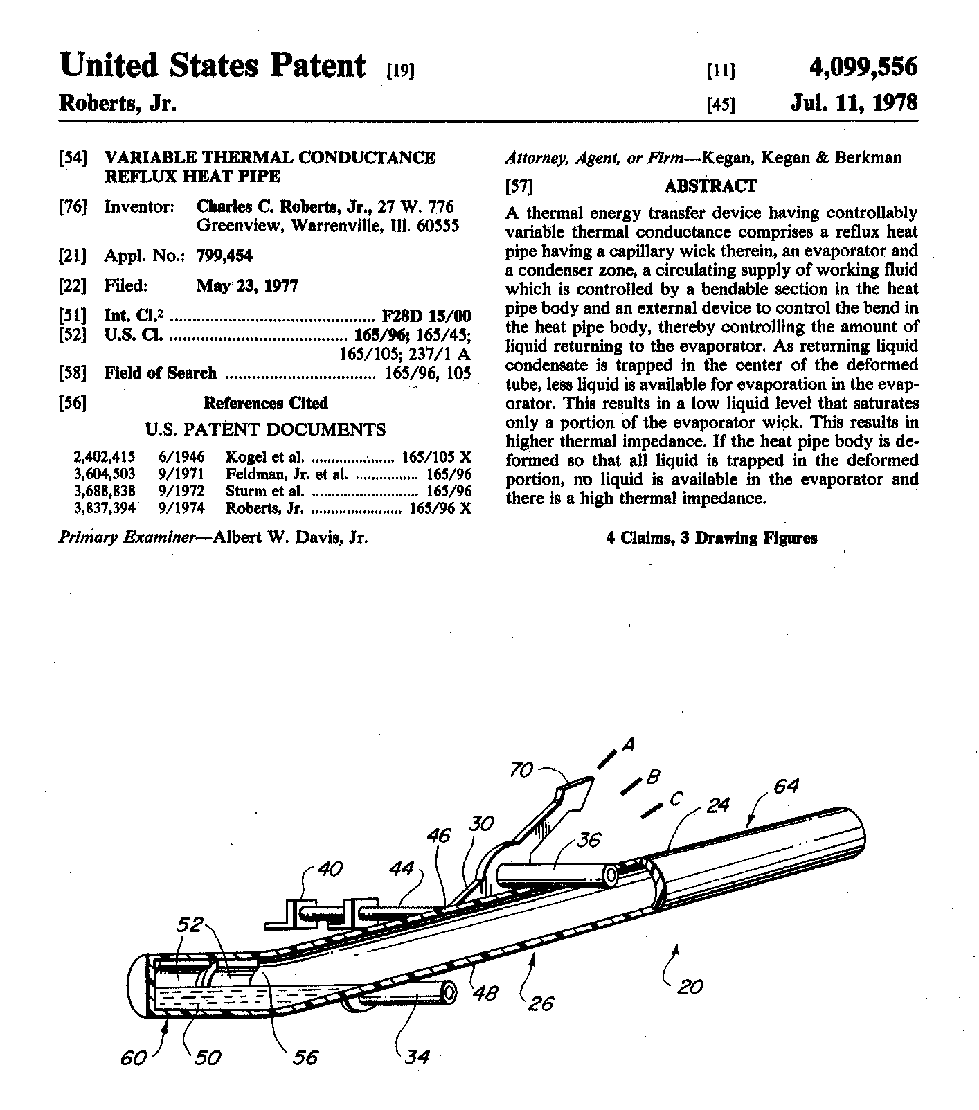 Patent Number 4,099,556 Variable Thermal Conductance Reflux Heat Pipe