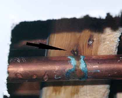 Figure 5 is a view of joists and flooring near a leak in a copper